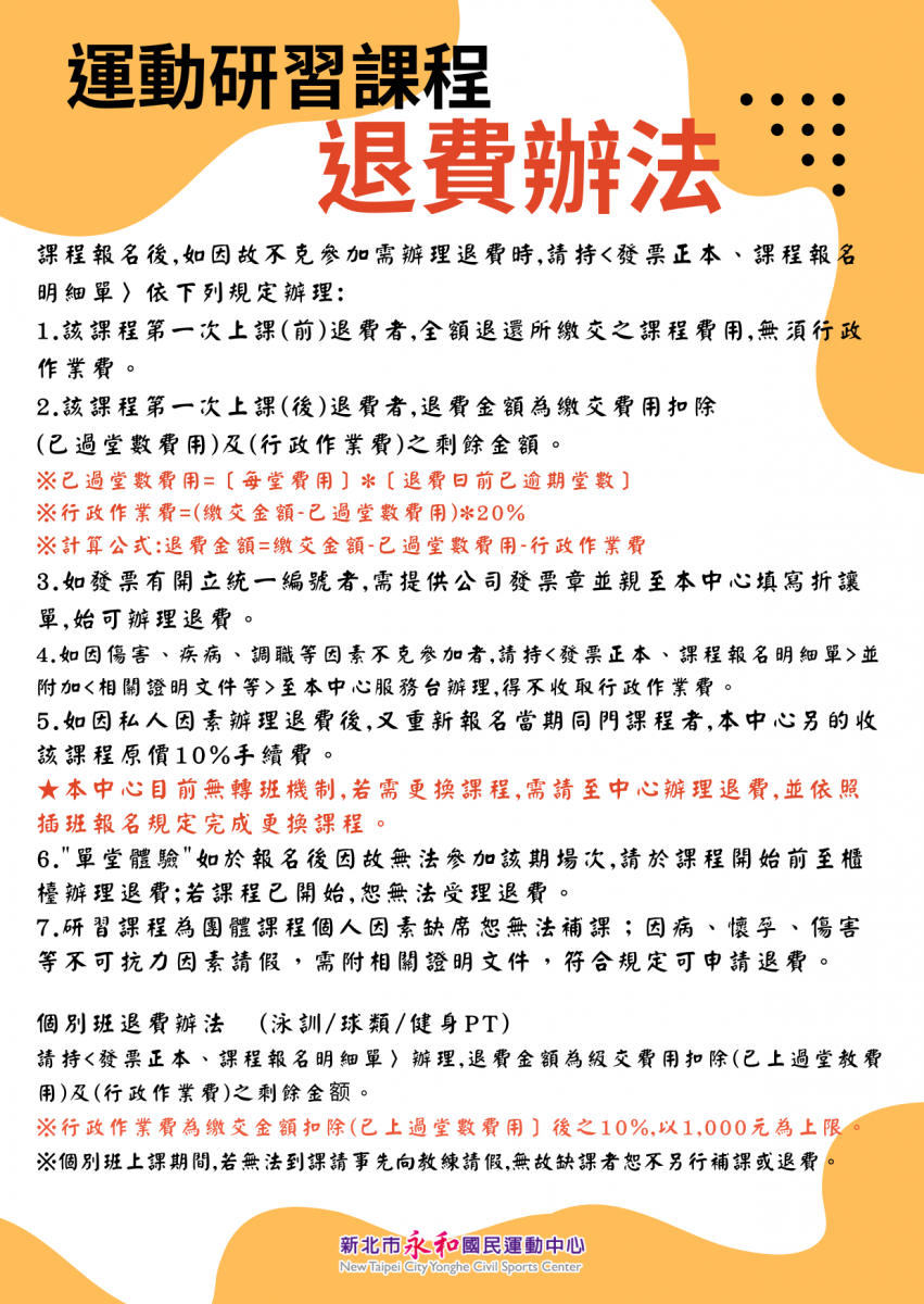 最新課程簡章: 114-6期(11-12月)運動研習簡章 網路報名: 請點我 (第一次使用,請先註冊會員) 單堂資訊: 114-6期(11-12月)單堂課程 (當日報名繳費後立即上課,請提前15-20分鐘完成報名) 課程退費辦法: 健身定型化契約: 永和運動中心健身PT定型化契約 永和運動中心健身房定型化契約